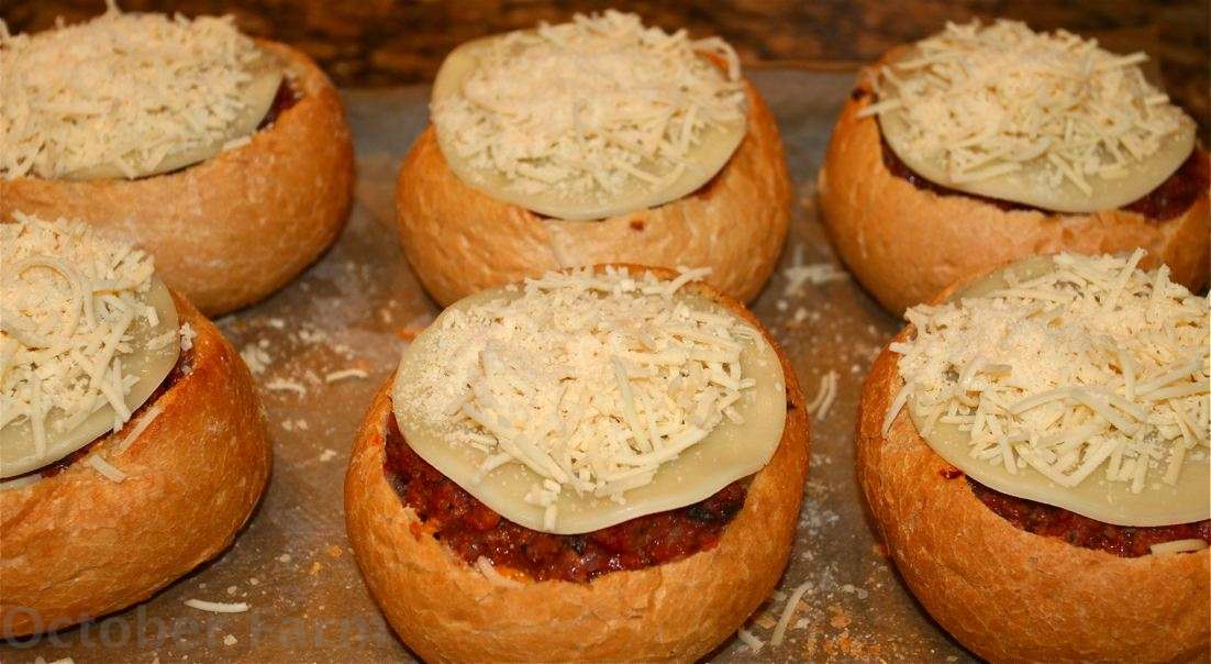 This is a new recipe which I will be making many times in the future. This had my family hootin' and hollerin'!!! You start out with some crusty rolls. I could not find small ones so I used the bread bowls that are typically filled with soup. Next time I will make these smaller. You cut the tops off and hollow out the inside leaving only about 1/4 inch of shell. Use the removed bread to make bread crumbs or bread pudding or stuffing.