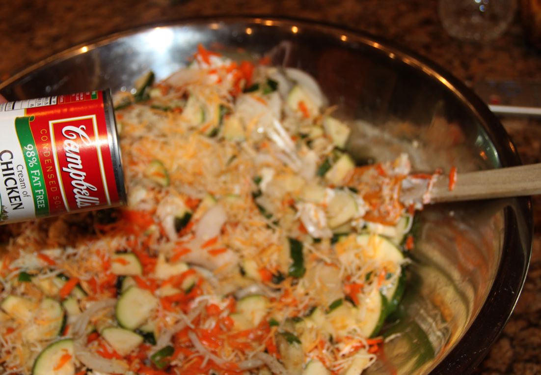 If you know someone that won't touch a vegetable with a 10 foot pole, this recipe is for you. This is an old recipe but is still scrumptious and perfect for this time of year. Zucchini casserole. I have a friend that has 4 kids under the age of 12, none of which would touch zucchini. I made them this recipe and they begged for more. I missed a few pics so hang in here with me and I will be as descriptive as possible. Begin by slicing 4 medium sized zucchini. You can add several more when you have more zucchini than you know what to do with. If you are having a 4th of July party, double this recipe because believe me..people are going to love it! Next, slice or dice a large onion and add it to the zucchini. I used a big sweet vidalia.
