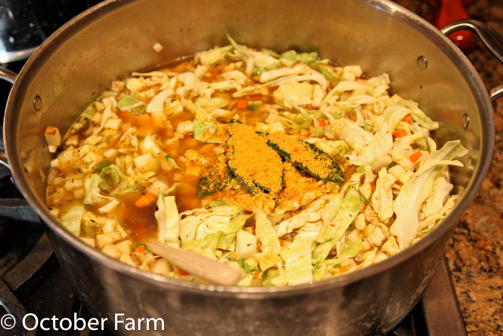 Dice some carrots, celery, potatoes, celeriac, turnips, a large onion and slice a head of cabbage. You can use any kind of root vegetables you like.