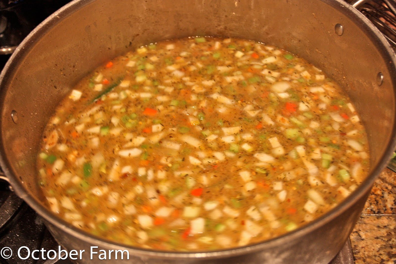 Turn the heat off and immediately throw in half of the diced veggies to stop the roux from cooking.