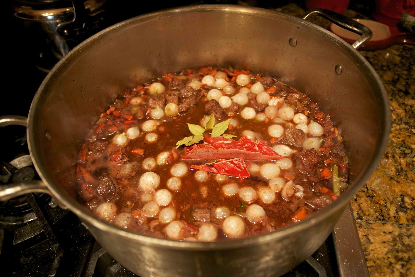 Add a bottle of hearty Burgundy wine. Scrape up any brown bits (fond) from the bottom.
