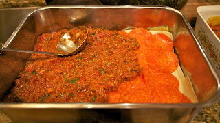 The cute firefighter really likes lasagna. He works very hard so I thought he deserved some when he came to visit this past weekend. My lasagna usually takes three days to make but I did not have time to make that recipe. Shopping is one of the difficult things for me to do with one hand these days so I had to whip this up from stuff I had on hand.