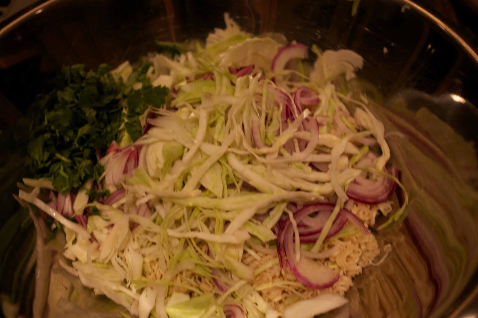 For the dressing, mix 1 C. of vegetable oil, 1/2 C. sugar, 3/4 C. rice vinegar, 2 tsp. salt, 2 tsp. black pepper and 1 tsp. sesame seeds. I added a couple tablespoons of sesame oil and some fresh cilantro too.