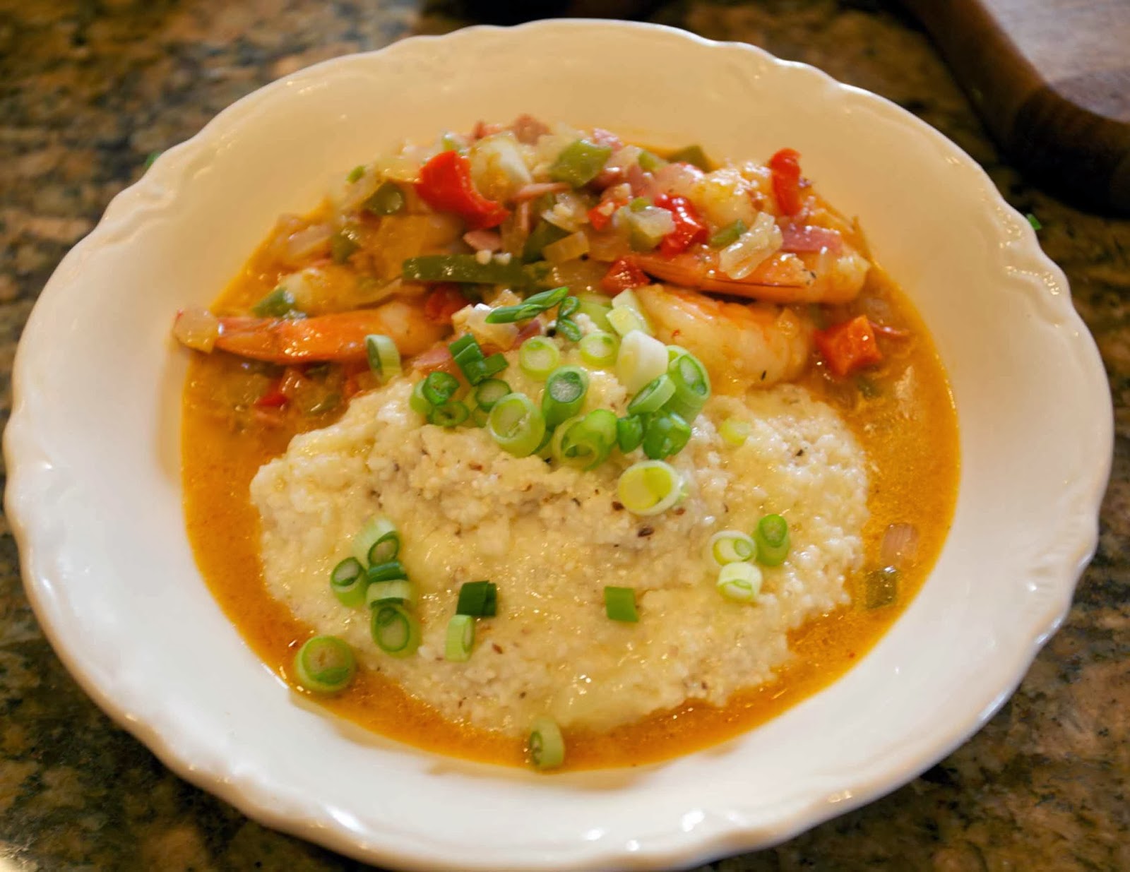 Place a big scoop of the grits in the middle of a bowl and surround them with some of the shrimp and sauce. Sprinkle some sliced green onions over the top.