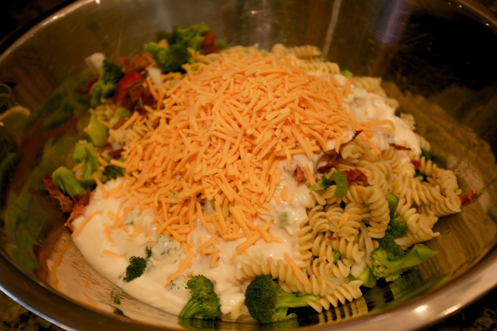 Pour the dressing over it and add the cheddar cheese.
