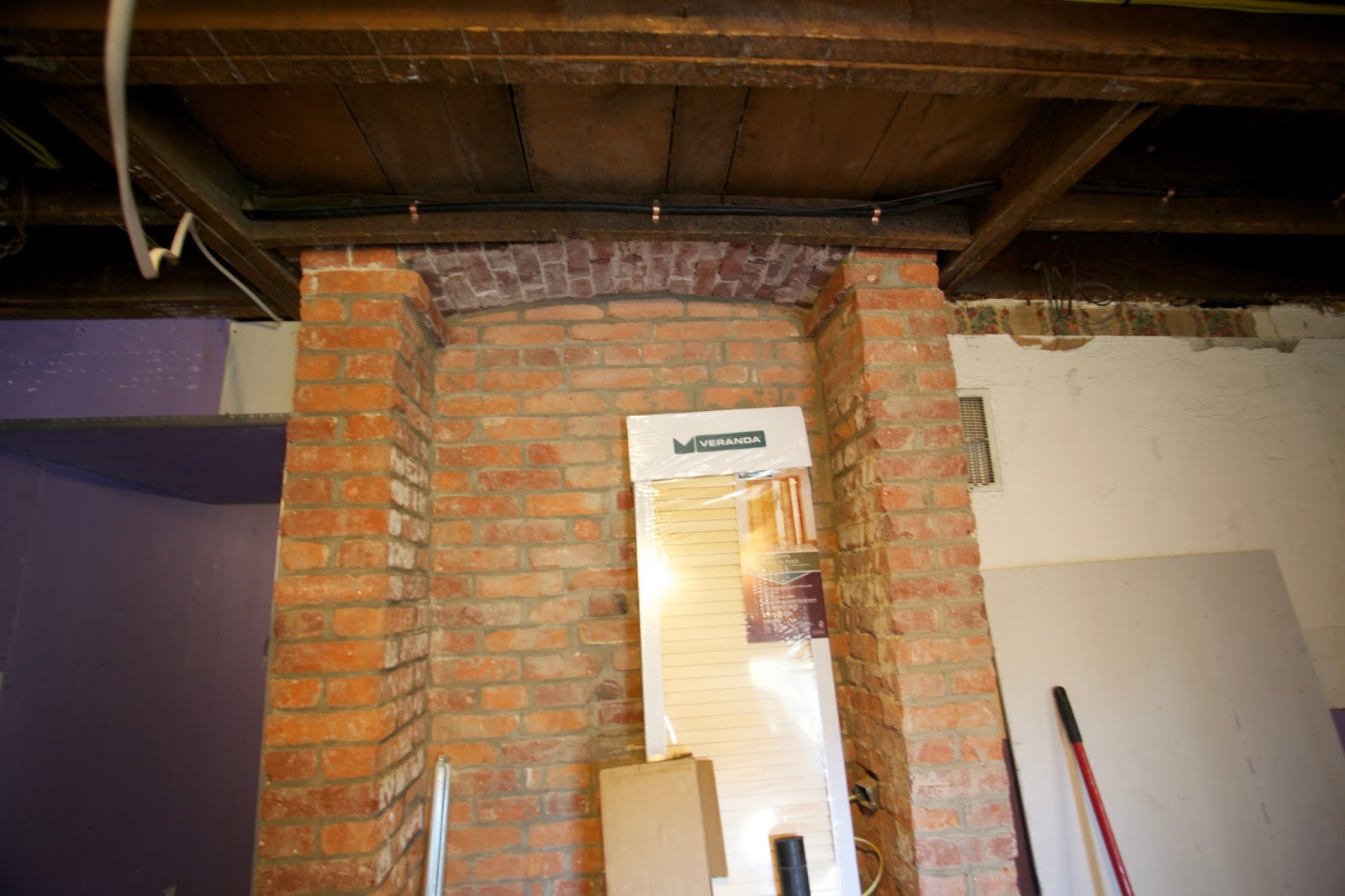 A plus was that we found this old brick, re-pointed it and it will add to the ambiance of the finished kitchen. We are building shelves between the columns.