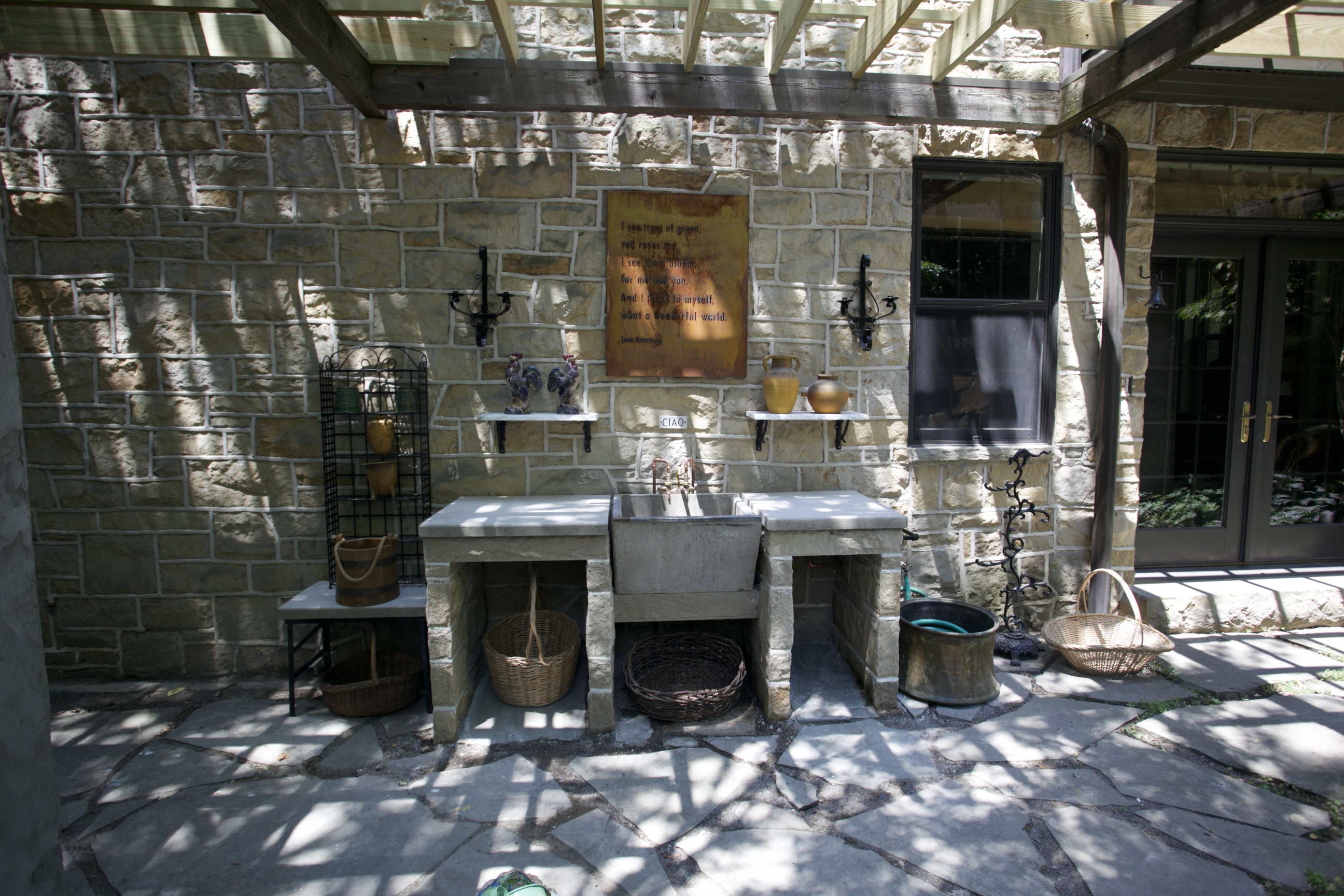 We looked at all types of outdoor counter materials and ended up having them made out of concrete. After living with sandstone and blue stone counters in other areas of the gardens, I was reluctant to use either of those again. The old utility tub, which is now the outdoor sink, is made from concrete so concrete ended up being the best choice. I love them.