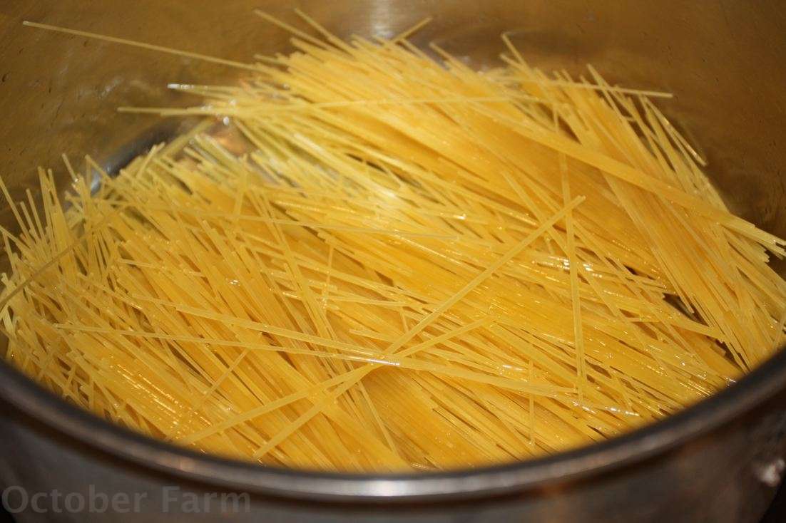 It will start to brown around the edges. Keep rolling it around until all of it is evenly golden brown. Frying the pasta this way gives it a very unique texture in the finished recipe. It is chewier and nuttier tasting than regular angel hair.